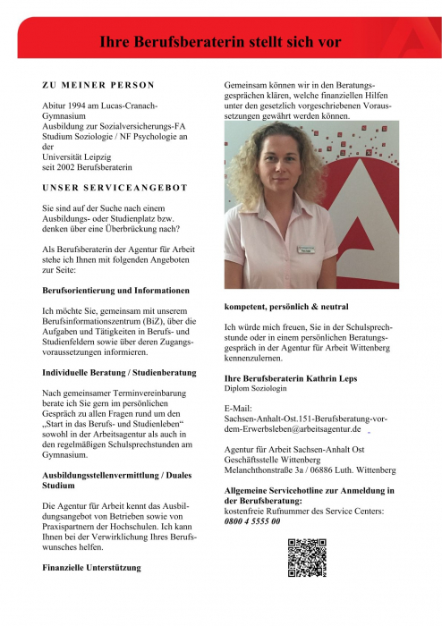 In vereinbarten persönlichen Gesprächen in der Arbeitsagentur selbst sowie in regelmäßigen Schulsprechstunden berät unsere Berufsberaterin Frau Leps die Lernenden ...