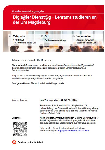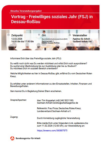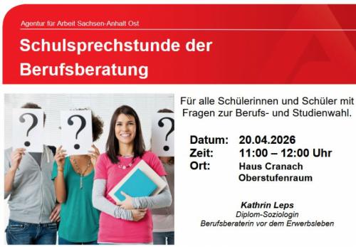 | E-Mail: | Sachsen-Anhalt-Ost.151-Berufsberatung-vor-dem-Erwerbsleben @arbeitsagentur.de |